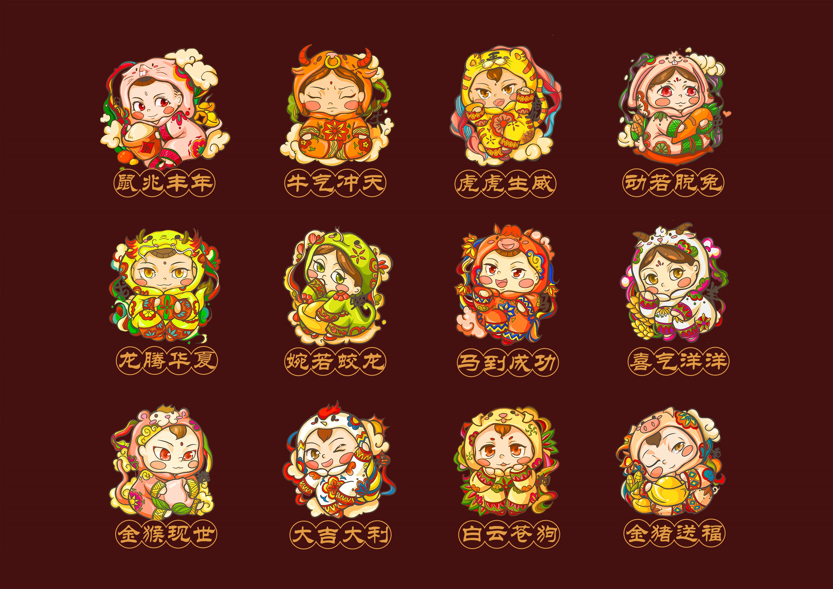 《Q版十二生肖》利用中国传统十二生肖的动物形象,结合了年画的特点,打造出具有“国潮风”的十二生肖系列。赋予了十二生肖不同的性格特点,使传统形象更加生动活泼。并且将其运用在了文创产品上,为十二生肖这一传统文化增添了新的可能。