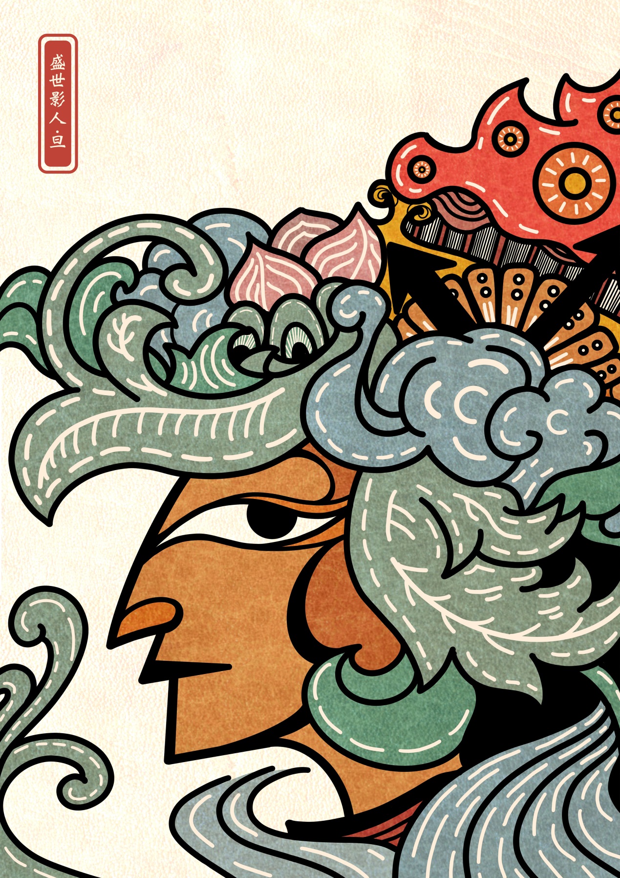 该插画将皮影戏中的“生旦净丑”四角人物特征与盛唐装饰纹样相融合。因为盛唐是中国的辉煌时期,艺术也非常多元、繁荣,将两者结合象征皮影艺术在未来能有繁荣发展。同时也象征在当今艺术多元开放的语境下,皮影能吸收更多的艺术精华,重获新生。