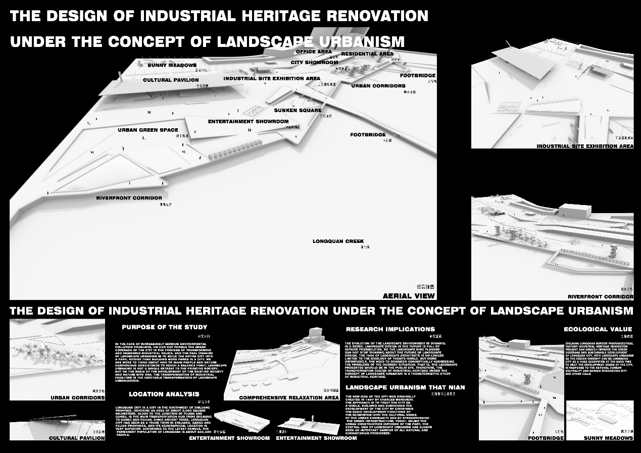总的设计以生态为基底,以景观为体现来建设景观基础设施。研究龙泉国境药厂周边及场地的环境,注重工业遗址的重新开发,对被污染的龙泉溪进行有针对性的修复和保护,特别关注沿河周围道路的功能性和排水防洪设施;以剑、瓷器文化为脉络,关注周边文化,综合发挥城市具有的龙泉文化内涵,提升环境的文化品位;以原规划为参考,充分考虑龙泉的总体规划,设计注重动态演变过程,结合其他周边的用地规划为龙泉国境药厂的改造做铺垫。