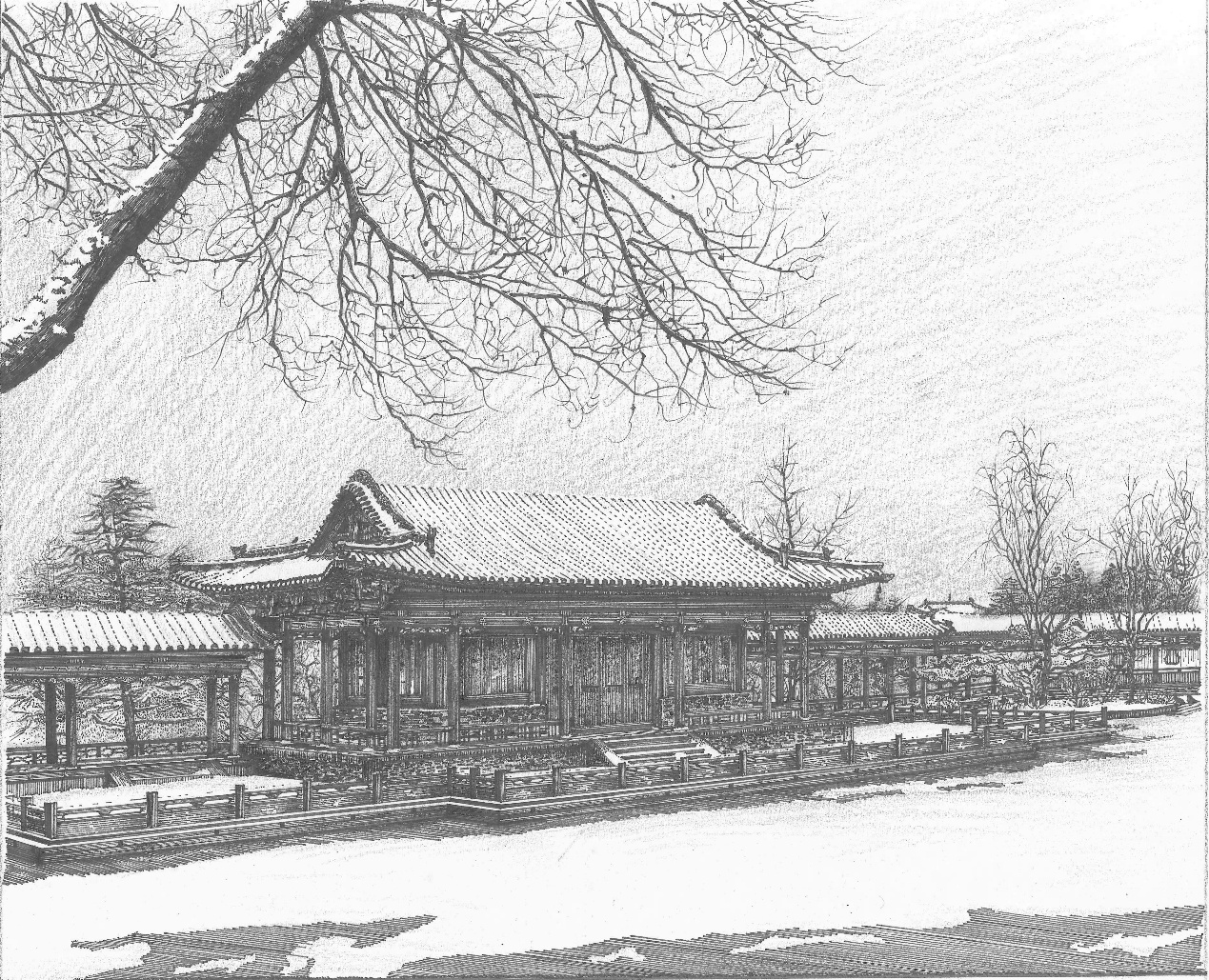 晋祠,是中国宋代建筑的瑰宝,其作为现存最早参照宋《营造法式》建造的官式园林建筑在中国古建中有着举足轻重的地位,本作品取材自作者一次在冬日初雪的晋祠中漫步所设的照片,通过钢笔画的方式展现了古建筑磅礴的生命力