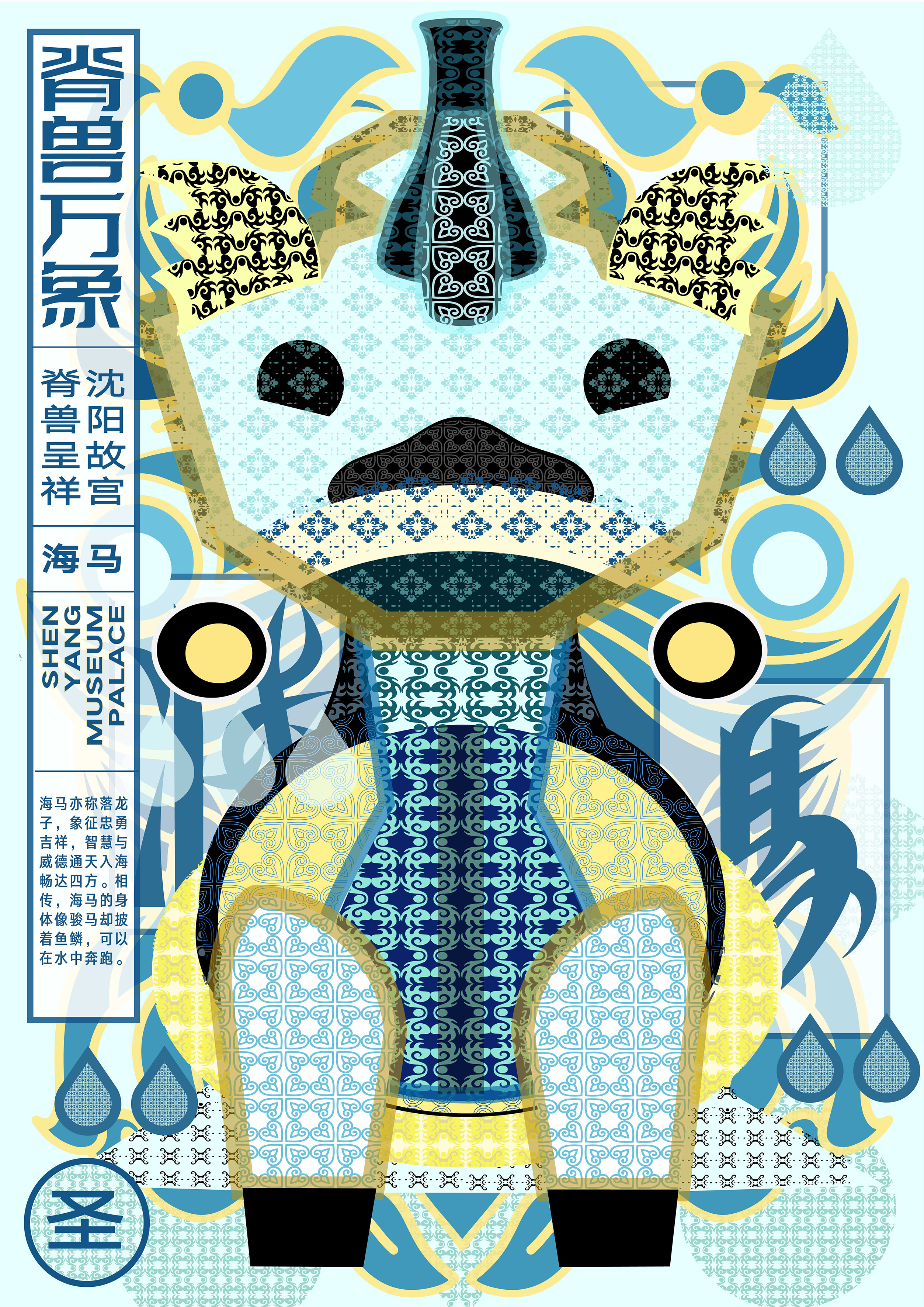 伫立,坚耸,华美,守护。仙人走兽是中国古代汉族建筑屋顶的屋脊上所安放的兽件。其功能最初是为了保护木栓和铁钉,防止漏水和生锈,对屋脊的连接部起固定和支撑作用。后来脊兽发展出了装饰功能,并有严格的等级意义。沈阳故宫现有仙人,龙、凤、狮子、天马、海马、狻猊、獬豸 、斗牛的走兽种类。作品以另一种角度去诠释脊兽的形态,轮廓更是用几何化去展现,与大家心目中的神兽形象完全不同。“一万人眼中就有一万种哈姆雷特” 脊兽万象打破陈规,营造了新的脊兽体系。